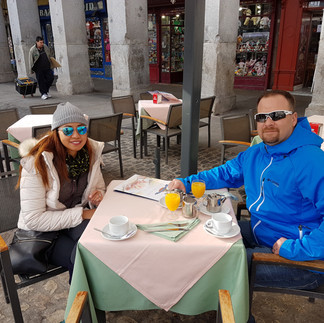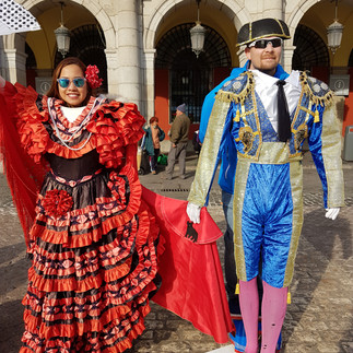The following morning, we eagerly set out to explore Madrid's vibrant streets. Our first stop was Plaza Mayor, a must-visit location in the heart of the city. Hungry from our adventures, we sat down at one of the restaurants lining the plaza to enjoy a delightful breakfast. Dining outside, surrounded by the old structures and cobblestone floors, transported us to another era. The lively atmosphere of the plaza was reminiscent of classic European squares, where local street performers entertained passersby with their talents in exchange for tips. Feeling inspired, we couldn't resist the opportunity to strike a pose in flamenco and matador costumes, capturing the spirit of Spain.